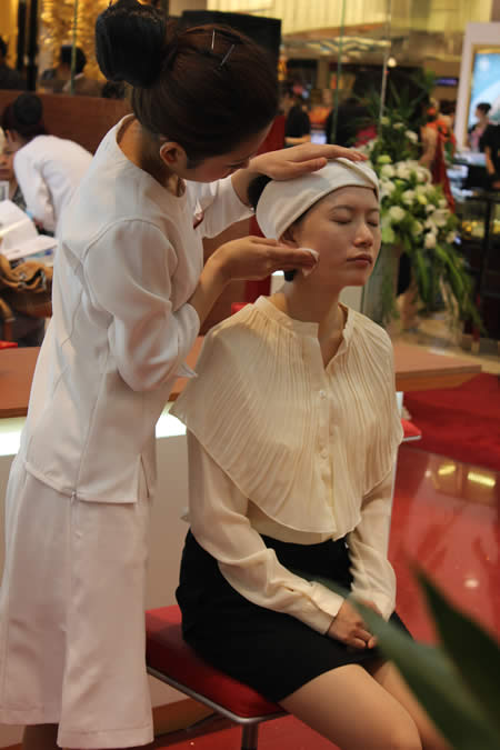 娇韵诗专柜导购用专业手法为顾客现场做植物精华护理