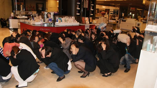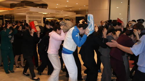 国芳百货员工按照防震紧急避险的标准动作进行演习