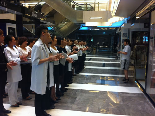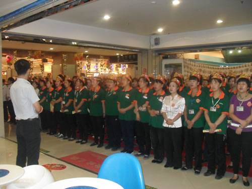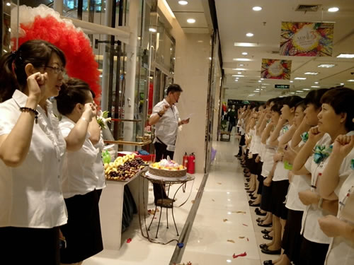 1、F1精品、化妆部主管向各位员工做店庆动员。