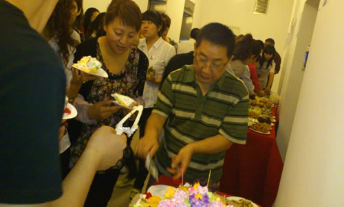 15、职能部门冷餐会,大家分享着美味的蛋糕和甜点。