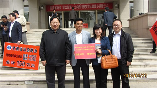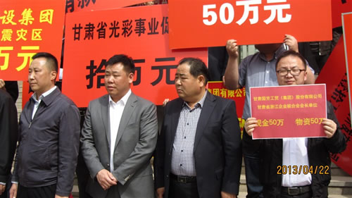 2013年4月22日下午15时,在甘肃省政协一楼,由甘肃省委常委、省委统战部部长泽巴足,省委统战部副部长、甘肃省工商联党组书记、第一副主席吴继德等相关领导出席了“甘肃省商会非公经济人士向四川雅安灾区献爱心捐赠仪式”。捐赠现场众多甘肃省非公企业向4月20日雅安市地震灾区进行了捐赠,广大爱心企业和人士用自己的实际行动对灾区同胞奉献了自己的真情和祝福。