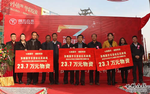 11月22日上午,张掖国芳百货公司7周年庆典之际,为我区甘浚镇光明村、花寨乡柏杨树村和平山湖乡困难群众一次性捐赠了价值71万元的物资。区委常委、常务副区长秦伟、副区长张兴锋出席了捐赠仪式。