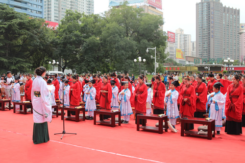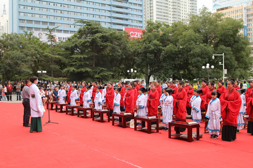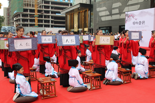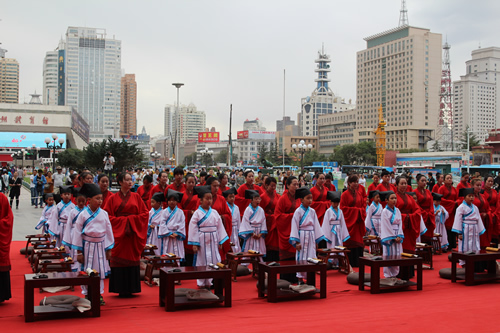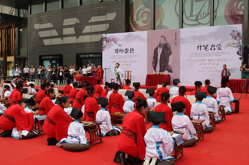 传承中国文化,启发学子奋发向上,再现古典礼仪之庄重恢弘。9月10日,国芳集团在东方红广场举行大型汉式拜师礼开笔礼仪式。本次活动共招募40名6-9岁的学子参加。拜孔子、点朱砂、击鼓明志,引众多市民观礼。